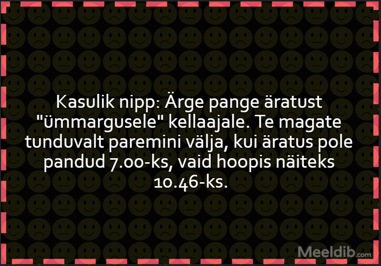 Meem Kasulik nipp: Ärge pange äratust “ümmargusele” kellaajale Published Why So Serious 11.03.2020 Aforism, tsitaat, mõttetera
