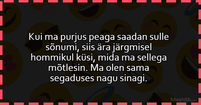 Meem Kui ma purjus peaga saadan sulle sõnumi Published Why So Serious 25.07.2020 Aforism, tsitaat, mõttetera