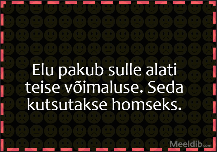 Meem Elu pakub sulle alati teise võimaluse. Seda kutsutakse homseks Published Jupats 18.03.2020 Aforism, tsitaat, mõttetera