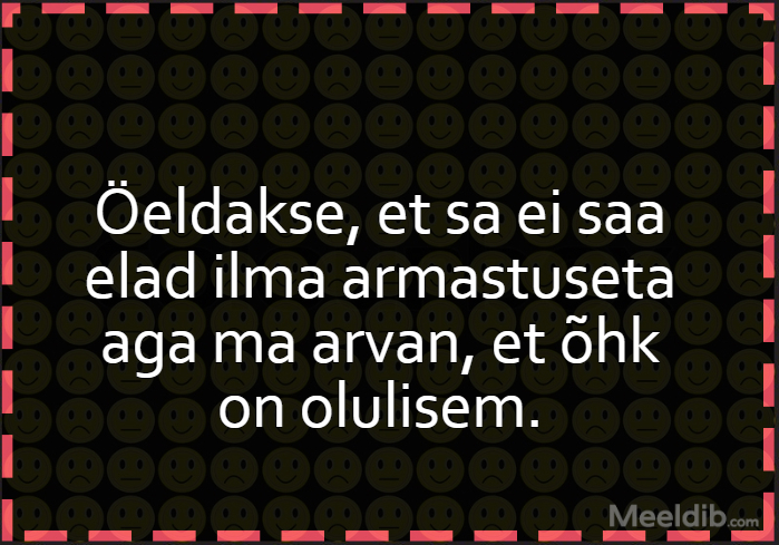 Meem Öeldakse, et sa ei saa elad ilma armastuseta aga ma arvan, et õhk on olulisem. Published Jupats 18.03.2020 Aforism, tsitaat, mõttetera