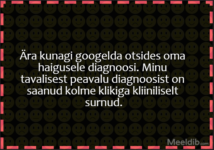 Meem Ära kunagi googelda otsides oma haigusele diagnoosi. Minu tavalisest peavalu diagnoosist on saanud kolme klikiga kliiniliselt surnud. Published Jupats 18.03.2020 Aforism, tsitaat, mõttetera