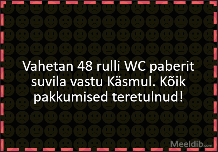 Meem Vahetan 48 rulli WC paberit suvila vastu Käsmul. Kõik pakkumised teretulnud! Published Jupats 12.03.2020 Aforism, tsitaat, mõttetera Muu melu