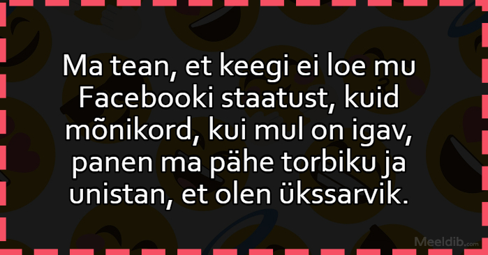 Meem Ma tean, et keegi ei loe mu Facebooki staatust Published Matu 03.04.2020 Aforism, tsitaat, mõttetera