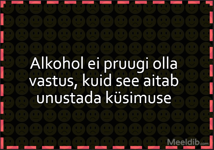Meem Alkohol ei pruugi olla vastus, kuid see aitab unustada küsimuse Published Matu 31.03.2020 Aforism, tsitaat, mõttetera