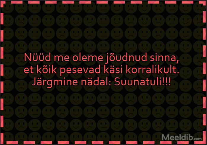 Meem Nüüd me oleme jõudnud sinna, et kõik pesevad käsi korralikult Published Matu 20.03.2020 Aforism, tsitaat, mõttetera
