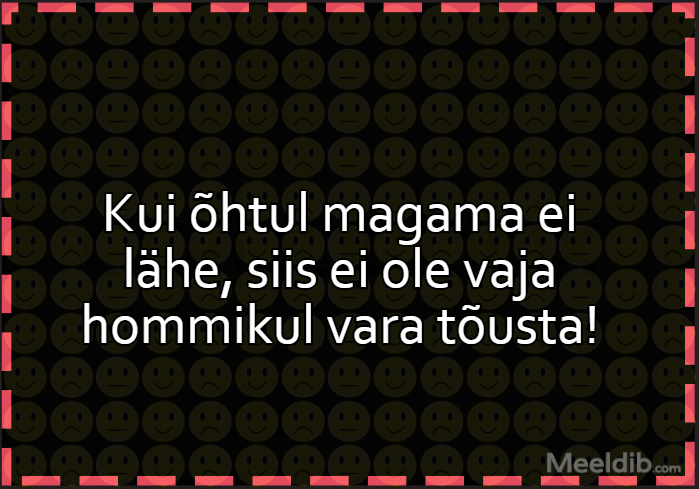 Meem Kui õhtul magama ei lähe, siis ei ole vaja hommikul vara tõusta! Published Matu 20.03.2020 Aforism, tsitaat, mõttetera