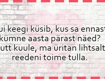 97193 AnekdootPese kael puhtaks!Naine mehele: “Kallis, pese kael puhtaks, meile tulevad kohe külalised!” Mees ei reageeri. Naine uuesti: “No mine pese nüüd kael puhtaks, meile tulevad ju külalised!”...