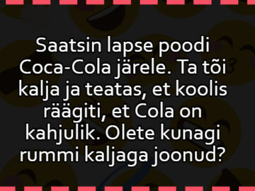 Naine helistab ämmale ja küsib: “Kes peab lapsele puhtad püksid panema, kui ta ennast täis laseb?” Ämm: “Ikka ema!” Naine: “Tule siis siia ja vaheta...