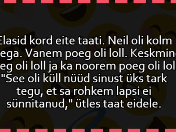 Ema küsib Jukult: “No pojake, mis loom sulle loomaaias kõige rohkem meeldis?” “Mulle elevant, aga issile kiisu,” vastab Juku. “Kiisu loomaias?” küsib ema imestunult. “Mingi...