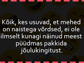 Naine: “Teil, mehed, on mõttes ainult üks asi – seks! Aga meie, naised, vajame tähelepanu!” Mees: “Tähelepanu, kohe hakkab seks!”
